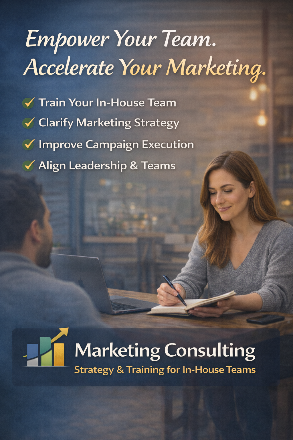 Our consulting services are built to support in-house marketing teams with clear strategy, practical training, and real-world guidance. We work alongside your team to sharpen decision-making, improve execution, and create systems they can confidently own long after the engagement ends.